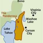 Hier ist die ungefähre Lage der fiktiven Ponderosa-Ranch aus der Fernsehserie Bonanza. Diese Kartendarstellung ist genordet, im Gegensatz zur Ausrichtung mit Ost oben im Vorspann der Serie.